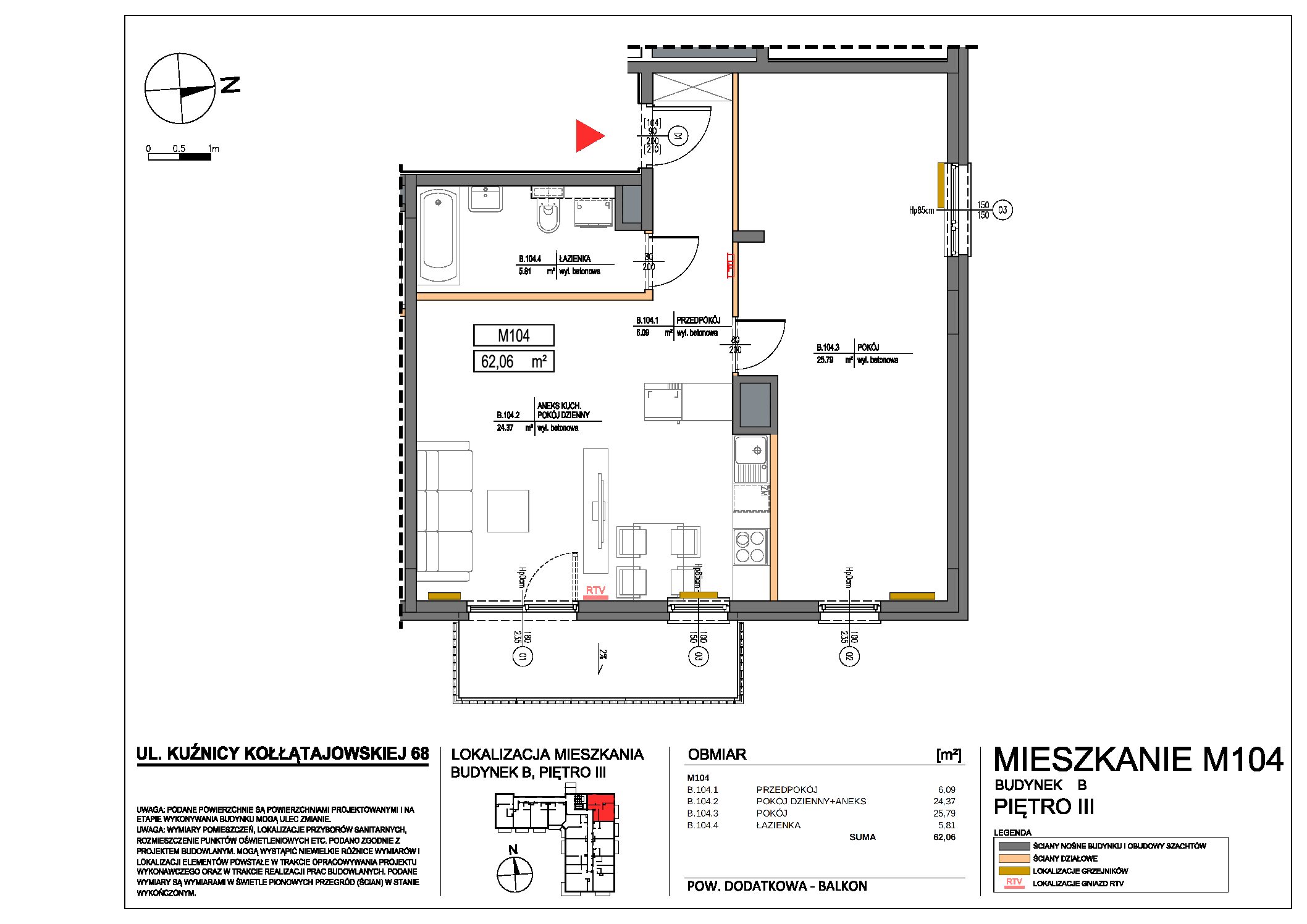 | 68 | 104 | 3 | 2 | 62.06 m2 | 9500 zł | 589 570 zł | Wolne | ||